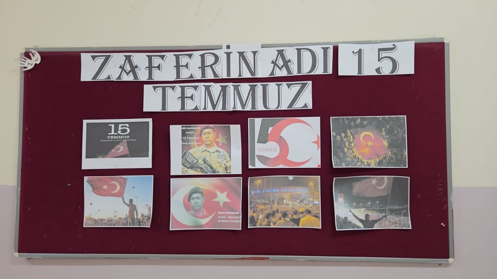 15 Temmuz Demokrasi Zaferimizin dokuzuncu yıl dönümü münasebetiyle okulumuzda 15 Temmuz Demokrasi ve Millî Birlik Günü Anma Etkinlikleri kapsamında 15 Temmuz ruhunu yansıtmaya ve yaşatmaya çalıştık. Bu darbe girişiminde canları pahasına vatanımızı koruyan sehitlerimizi minnetle ve rahmetle anıyoruz.