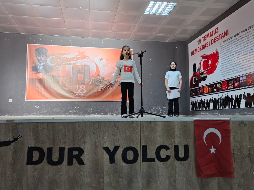 Okulumuzda 2I sınıfının hazırlamış olduğu 18 Mart Çanakkale Deniz Zaferi ve Şehitleri Anma Günü programı gerçekleştirildi. Programda şiir, orotoryo gibi çeşitli etkinlikler yer aldı. Emek veren sınıf öğretmenimiz Özge Cansu AYDEMİR'e, sevgili öğrencilerimize ve katılım gösteren değerli velilerimize teşekkür ederiz.